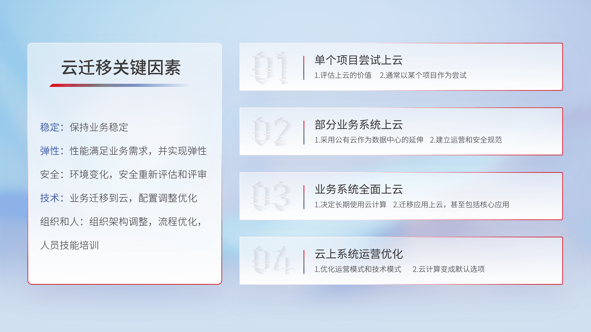 结合实际业务,,从规划设计、、云平台选型、、、、云原生改造、、、、数据迁移、、集成交付,,,迁移全过程为客户识别最佳上云路径,,,,做好风险识别管理,,,设计网络架构、、身份权限、、、安全审计合规、、、操作审计、、、、日志审计、、监控告警策略、、多站点容灾设计等,,对云上基础设施进行整体规划,,提升IT治理水平,,以满足弹性、、、高可用、、、、高性能的需求。。。。